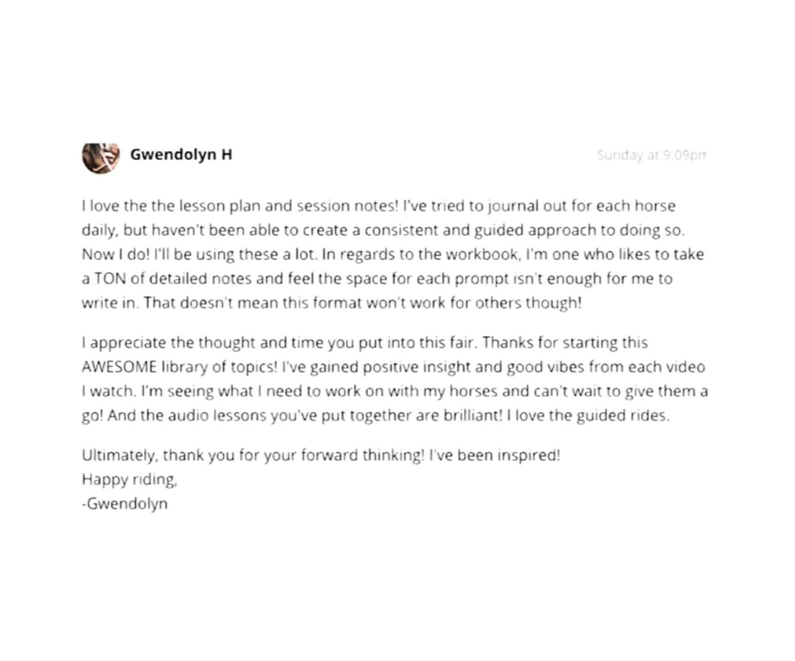 "This is so helpful, having a well thought out workbook to get the most of the experience is just great. I find if I write things down, I retain so much more. And then I can bring my workbook out to the barn with me , and practice what I have learned" ~ Lisa Goodwin