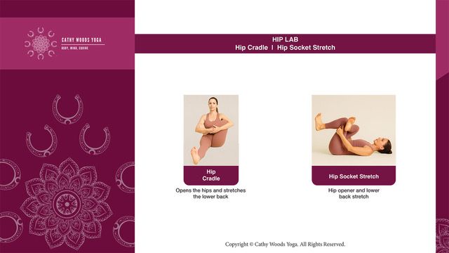 • Hip Socket Pose – to maintain open, flexible hips and help relieve lower back tightness